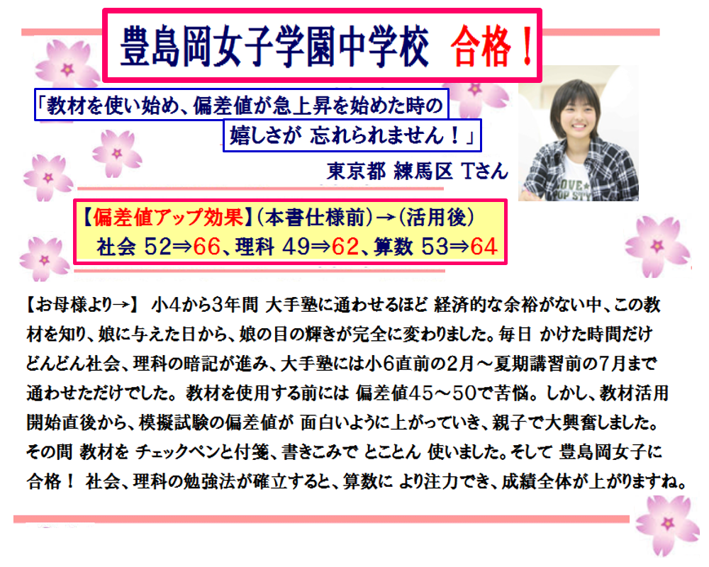 娘は 今まで 同級生が SAPIX、日能研に通えている中、結局 自分は通えていないこと、勉強方法も定まらず、たまに 受けた四谷大塚の4科目無料模試でも、社会、理科、算数の偏差値が 45~50辺りから抜け出せず、本当にもっと効果的な 勉強法が欲しかった中、この教材を与え、勉強法を説明した日から、娘のやる気が完全に変わり、強烈にスイッチが入りました。 毎日 かけた時間だけ どんどん社会、理科の理解・暗記が進み、市川中学に合格したお子さんと同様、塾には小6直前の2月~夏期講習前の7月まで通わせ(この期間で、受験に必要な全範囲を集中的に学習でき、入塾受け入れ可能だった日能研を選びました)、その間に 苦手だった中学受験算数 独特の文章題の解法も次々と身につけ、模擬試験を受けるごとに どんどん偏差値が上がり、そして... 小6の2月上旬、第一志望で難関の「 豊島岡女子学園 」に合格できました!!